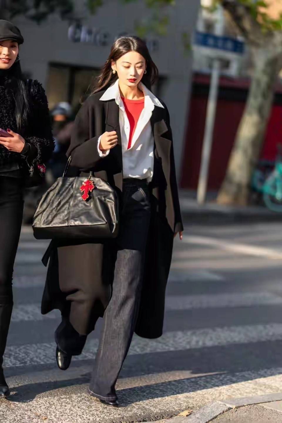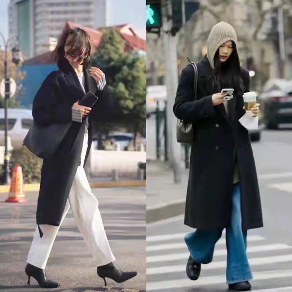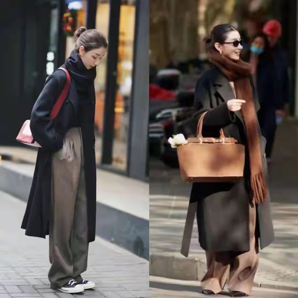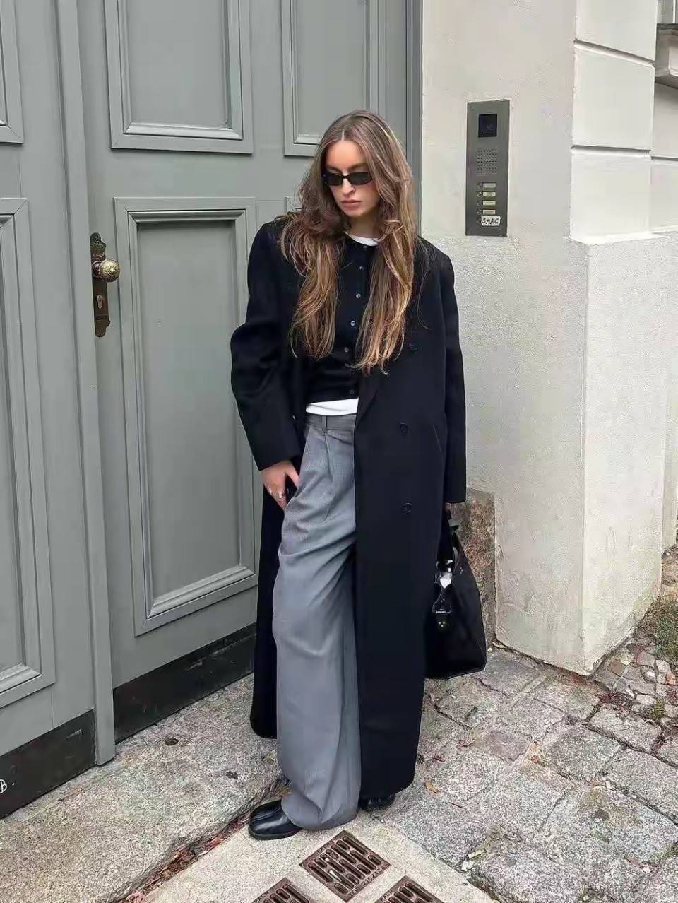 当然啦,就算是黑色的大衣外套,只要你选对了,穿起来也是不失时尚感,例如下面用的就是黑色的大衣外套,再搭上一条比较有垂坠感的西装,直筒阔腿裤,脚上穿着一双帆布鞋,或者是皮质的高跟单鞋,这一身穿衣打扮能够使得穿搭者变得更加成熟稳重又大方。