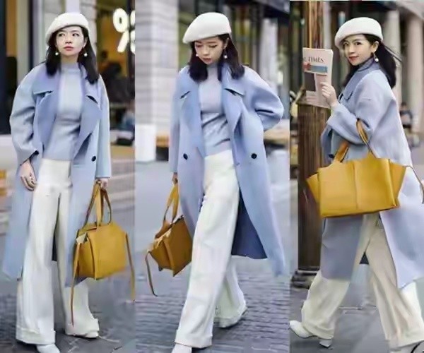 我们还可以尝试选择雾霾蓝的大衣外套,内搭同色系的针织衣服单品,下半身直接用最为百搭的白色直筒阔腿裤,脚上穿的皮质的白色粗跟单鞋,头上戴了一顶白色的贝雷帽,这样的穿搭让你看起来更有活力,而且保暖又舒适。