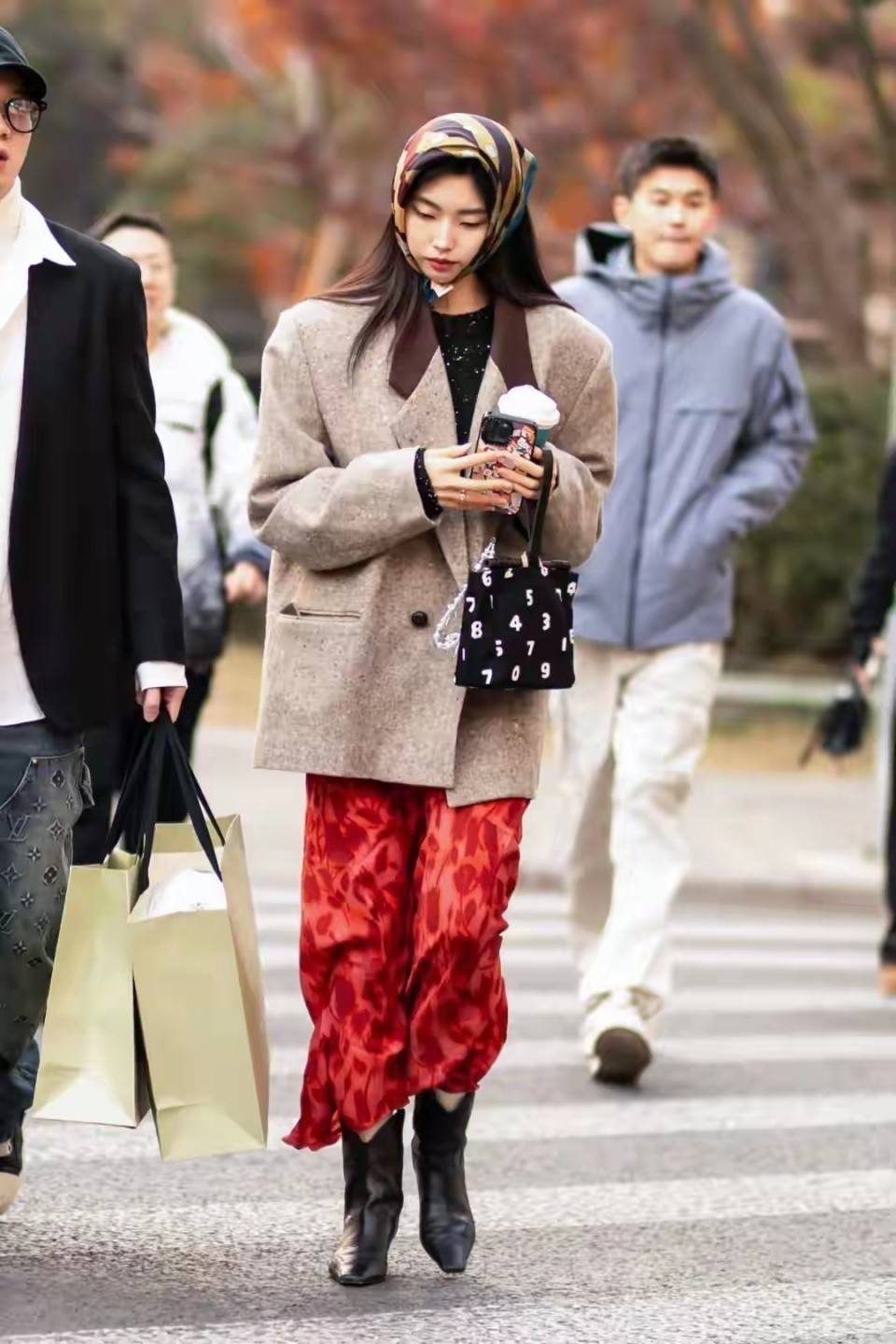还有就是穿衣打扮也不要花哨,过于花哨也不好看,例如下面用一件大衣短款西服款式的外套,内搭黑色针织打底衫,本身上衣和内搭的衣服色彩已经是非常有品质,就是因为下半身的这一条,红色的印花半身裙来组合,影响了整体的衣服风格走向,瞬间拉低好几个档次。