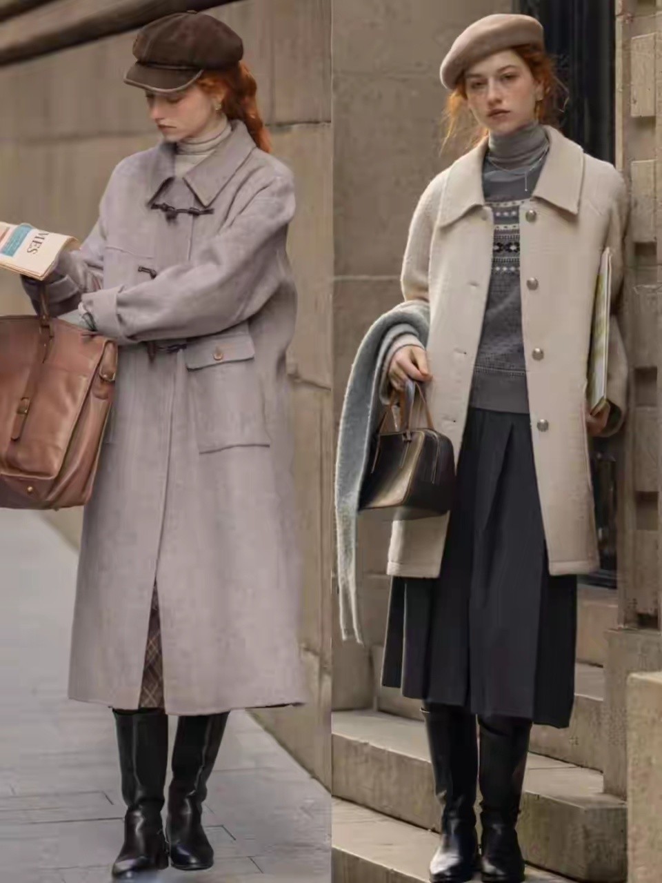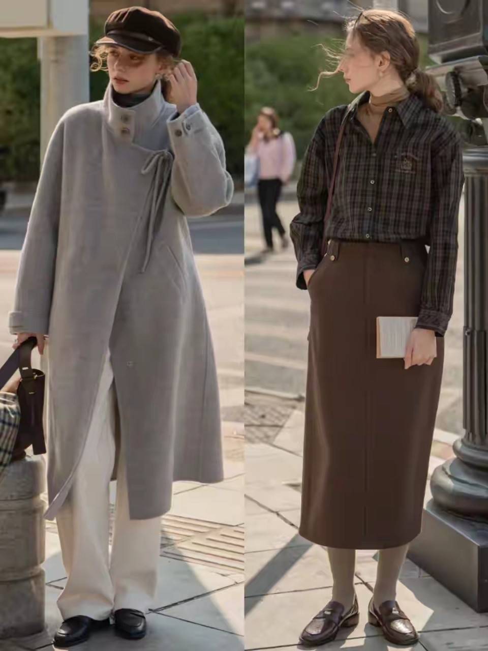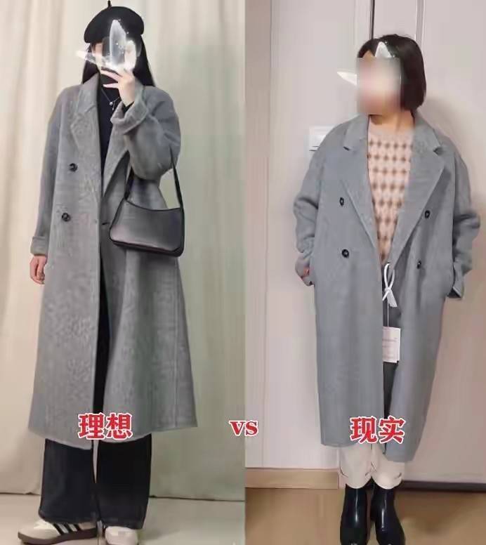 自己明明也是穿的最为基础的灰色大衣外套,但为何达不到别人穿出来的理想效果?这就涉及到如何选择适合自己身材的衣服版型了,比如下面这两件灰色大衣外套,一件做了一个高腰收腰的设计,而右边的这一件灰色大衣外套腰间的位置还往外扩了一点,显得整个人臃肿肥胖。