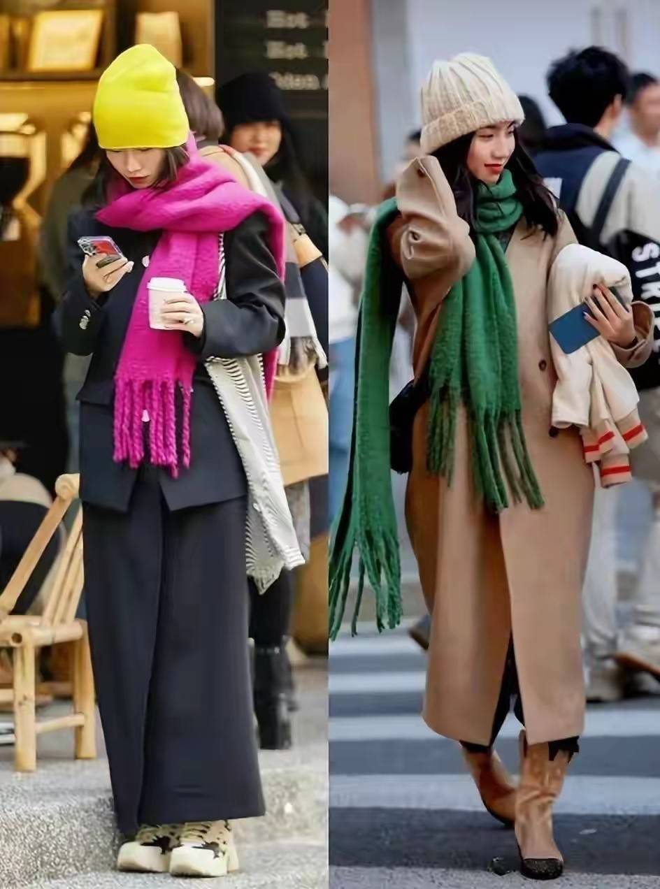 如果确实自己年轻貌美,想要增加造型的时尚感,你可以在配饰上下点功夫,比如下面的针织帽,还有针织围巾的色彩,就能点亮整个造型,让你看起来更有活力。