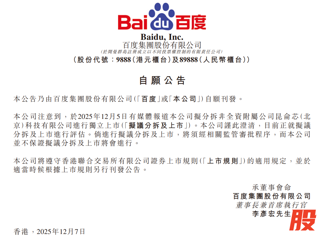 12月7日晚,百度集团在港交所发布公告称,公司注意到有媒体报道公司拟分拆非全资附属公司昆仑芯(北京)科技有限公司进行独立上市。目前,公司正就拟议分拆及上市进行评估。若进行分拆及上市,将须经相关监管审批程序,公司并不保证分拆及上市将会进行。